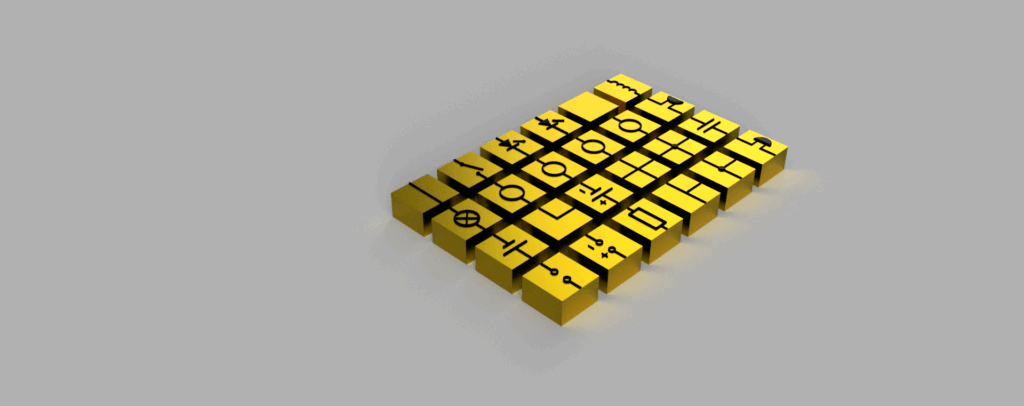 mit bekannten Klemmbausteinsystem kompatible Bausteine  für Schaltsymbole, die sich gut zweifarbig drucken lassen. Für M, V, A sind “leere” Kreise vorgesehen, in welche Buchstaben geklebt werden können.